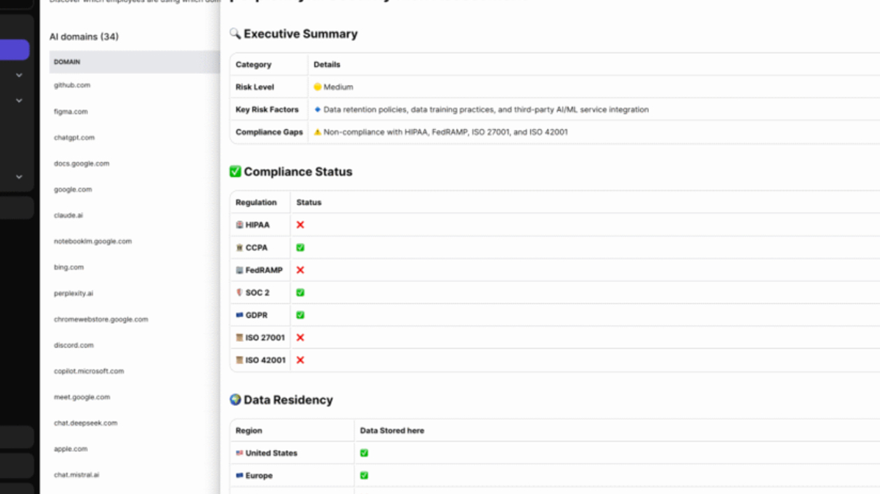 Detects unauthorized or unsanctioned AI tools and services used within the organization, providing visibility into shadow AI activities.